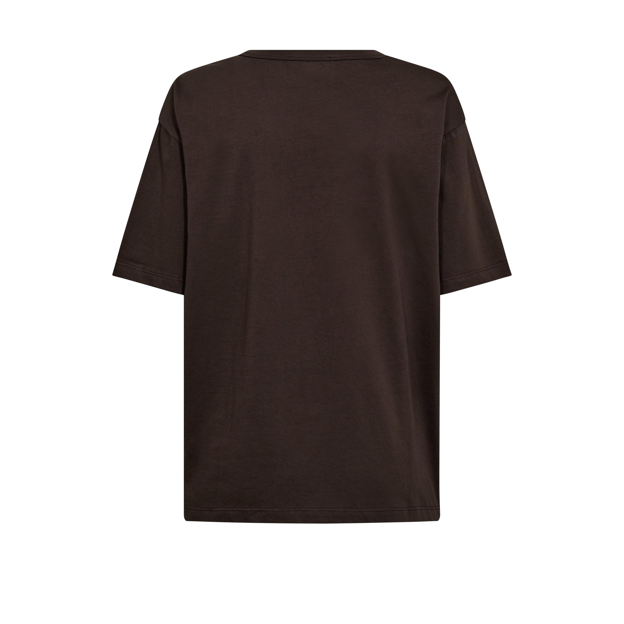 T-shirten er fremstillet i blød bomuld og har rund hals, korte ærmer og et let boxy fit, som giver et moderne, afslappet look. Den mørke nuance og det detaljerede print gør den nem at style – både til jeans, nederdel eller under en blazer.
