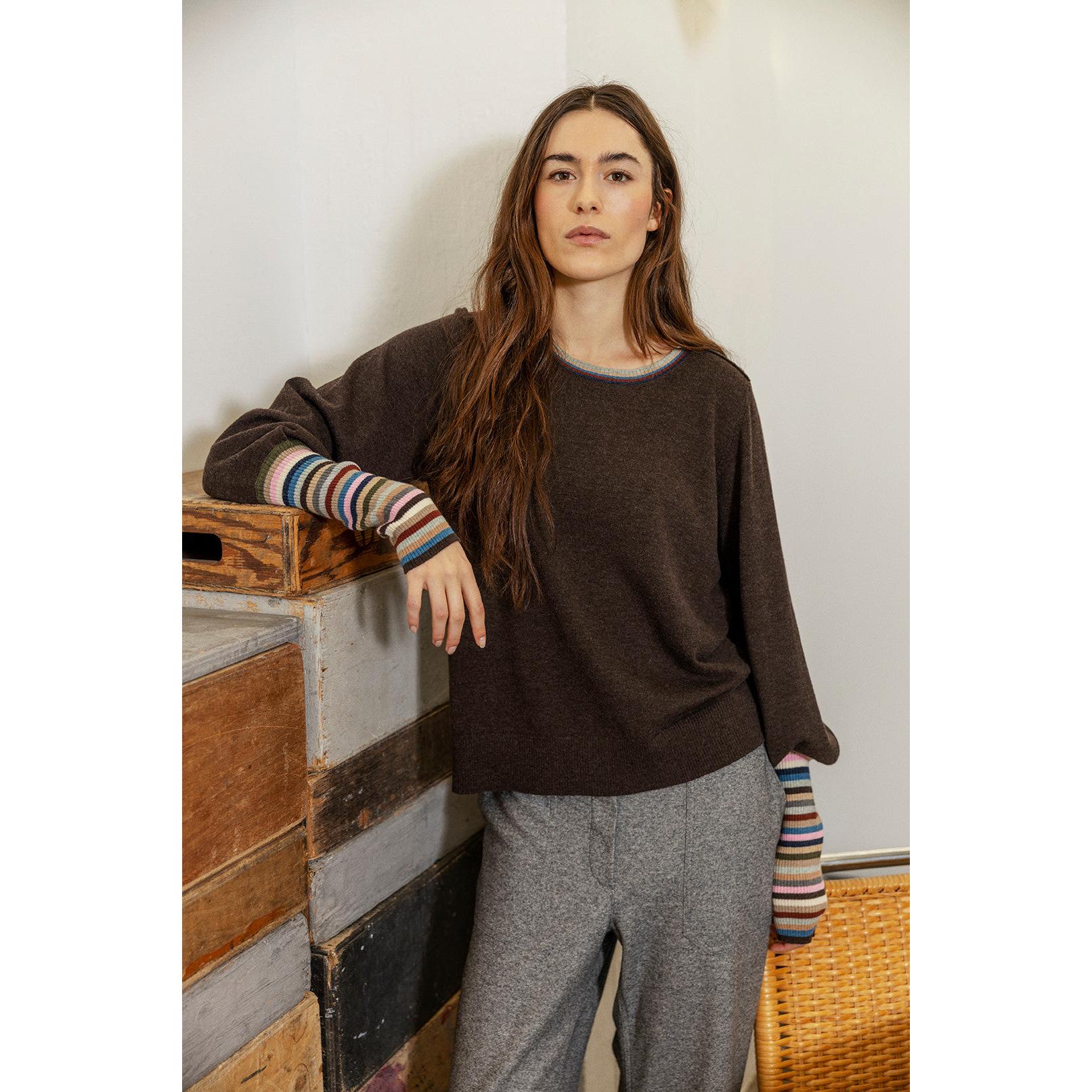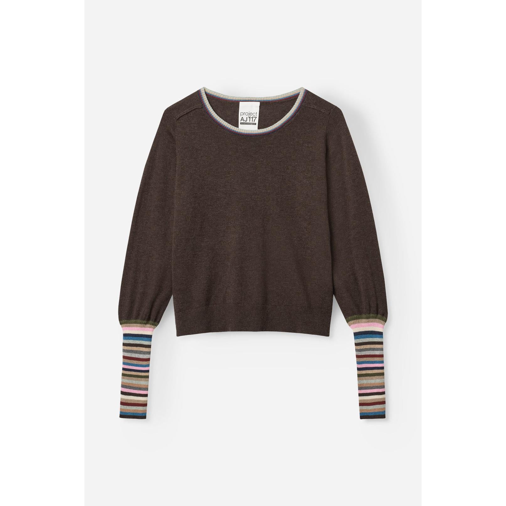 Sigga fra Project AJ117 er en let og blød strikbluse med afslappet pasform og rund hals. Den er designet i en varm brun nuance og har strikkede striber i halskant og ærmekanter, som giver et farverigt twist til det enkle udtryk.