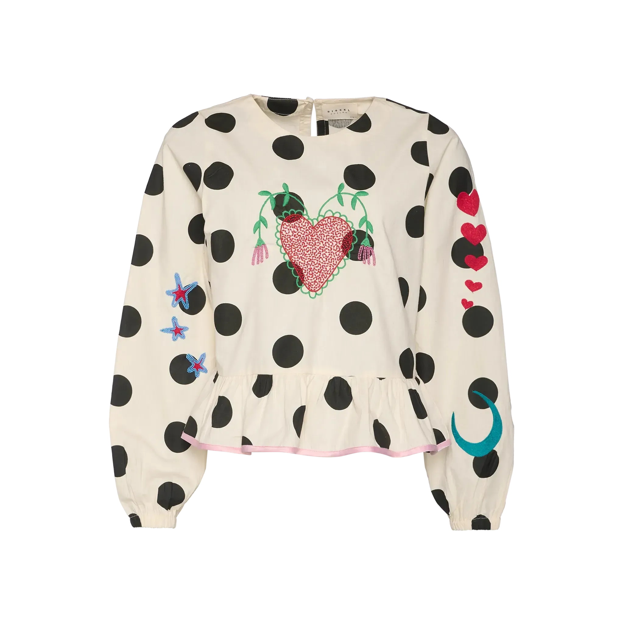 Toppen er dekoreret med små broderede symboler og perler – hjerter, stjerner og en måne – der giver den et charmerende og personligt præg. Den nederste kant har en smal satinbåndsafslutning i kontrastfarve, som fuldender det romantiske udtryk.
