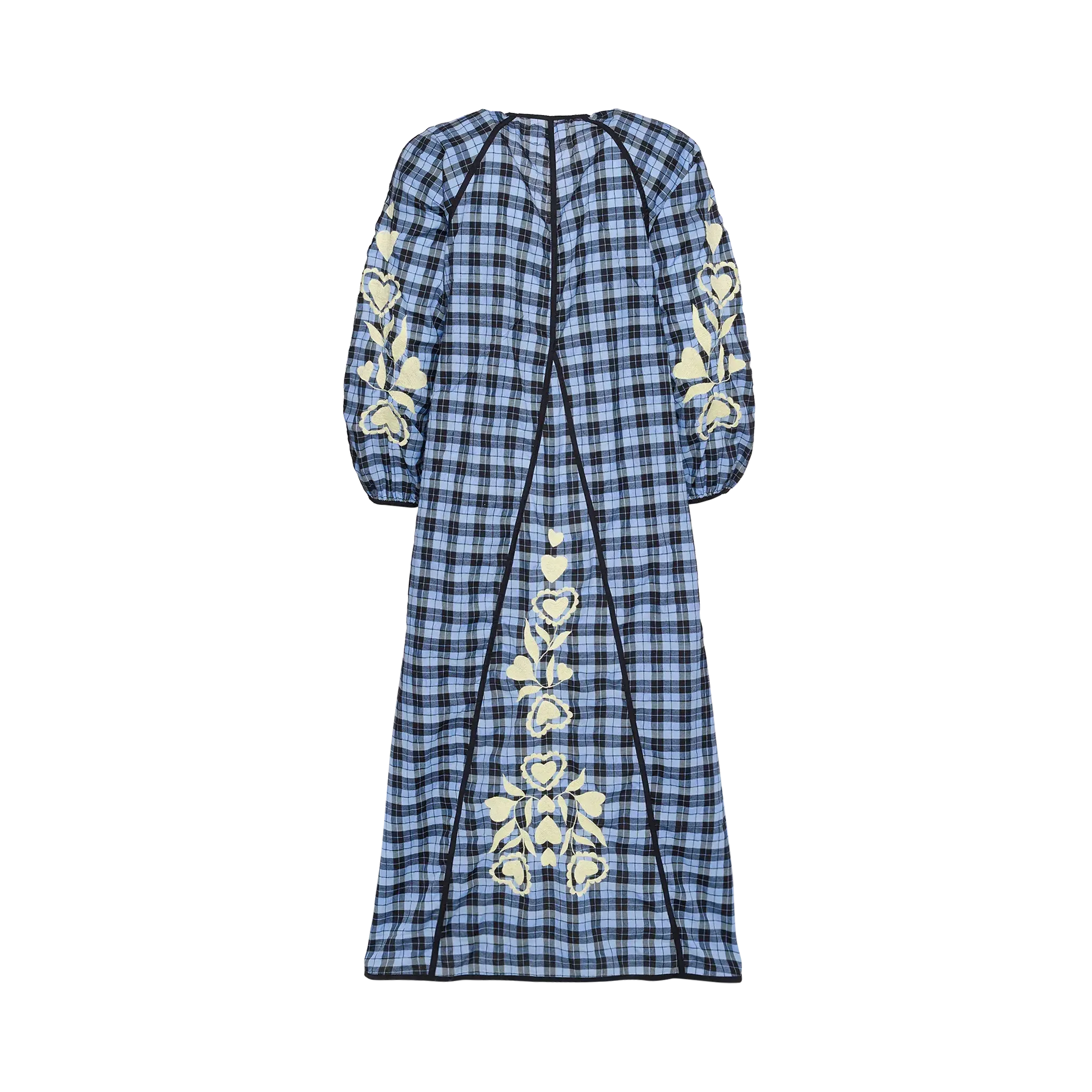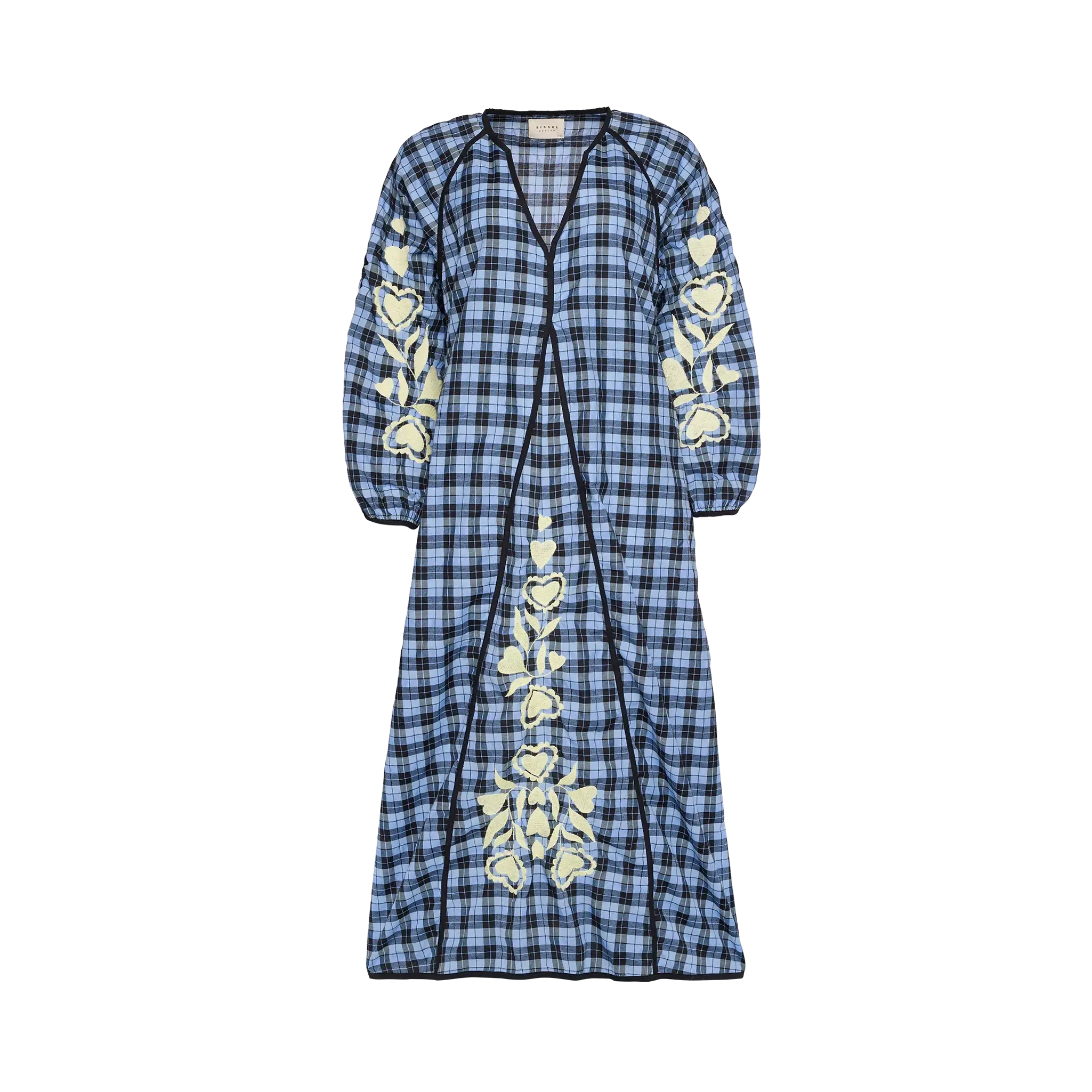 Denne kjole fra Sissel Edelbo er en lang og løstsiddende model i ternet blå og sort med bløde, gule broderier i form af blomster og hjerter. En kjole med karakter og ro, der emmer af håndlavet stemning.