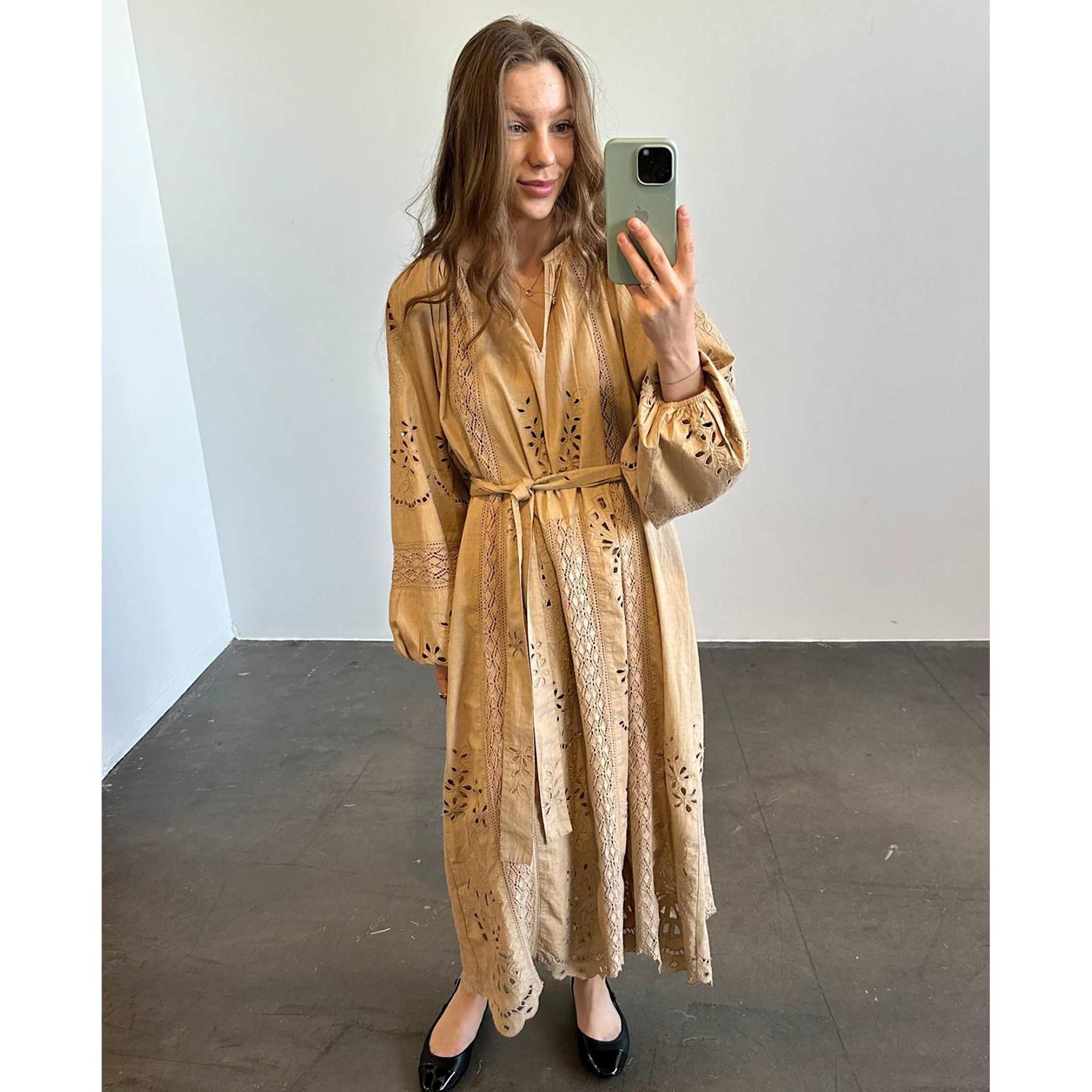 Kjolen har lange, voluminøse raglanærmer med elastik ved håndleddene og praktiske sidelommer. Den medfølgende aftagelige bindebælte giver mulighed for at forme taljen, hvis man ønsker et mere markeret snit. Bunden afsluttes med bølgede kanter og fine blondebånd, der understreger kjolens lette og elegante look.