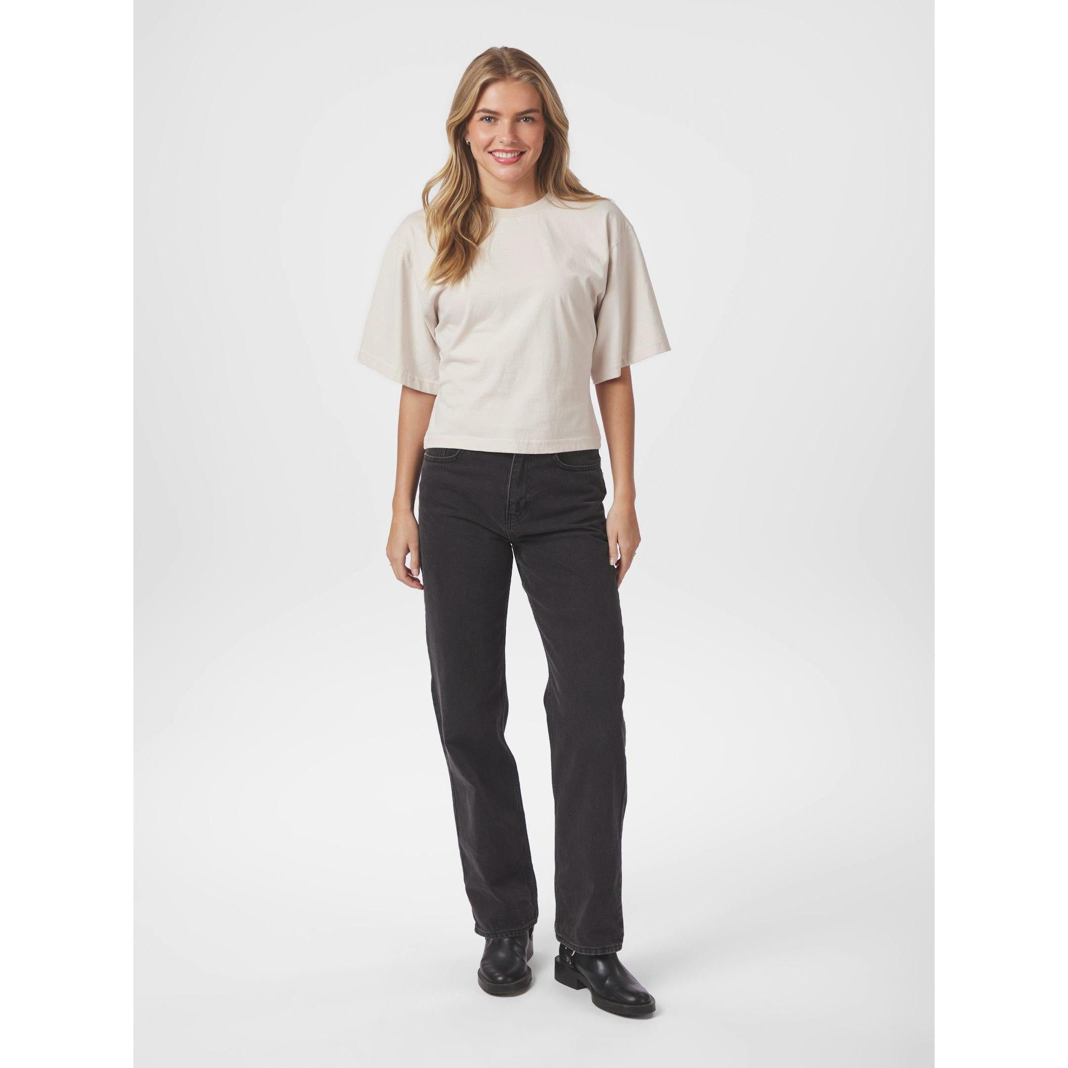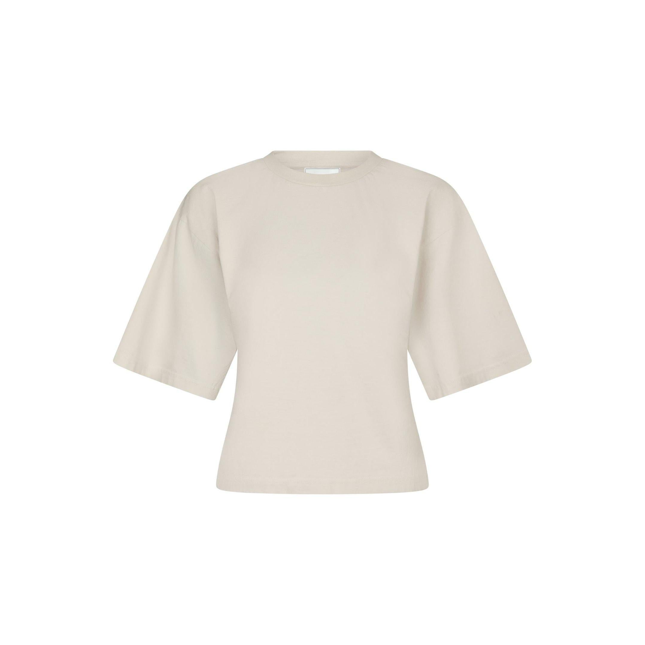 T-shirten har rund hals, brede ærmer og en let kortere længde, som gør den perfekt til højtaljede bukser og nederdele. En tidløs model med små detaljer, der giver kant.