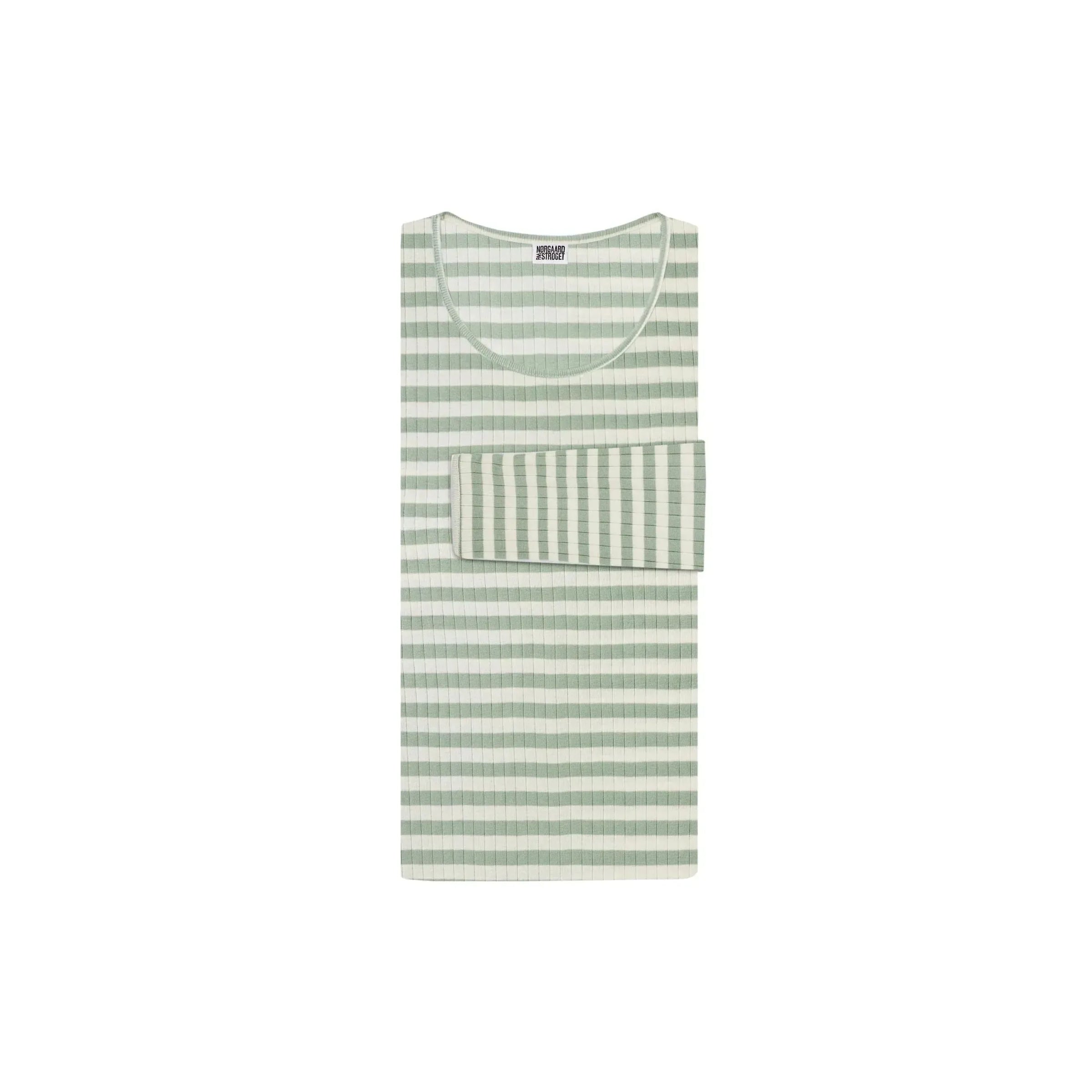 Den langærmede t-shirt 101 Broadway fra Nørgaard Paa Strøget er den klassiske #101 t-shirt med to brede striber. Nørgaard Paa Strøgets #101 t-shirt er designet i 1967 af Jørgen Nørgaard. T-shirten er strikket, farvet og syet i Danmark og lavet i 100% bomuld. T-shirten er onesize, men fås i to forskellige længder. I Minlillebutik har vi blot regular længde, som fra skulder til bund måler 68 cm.